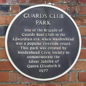 Guards Club Park was created by the Civic Society to commemorate the Queen's Silver Jubilee in 1977 and has been maintained by the Royal Borough since 1980. This is beyond doubt the Society’s most ambitious – and most visible – achievement. Originally, the Brigade of Guards Boat Club provided recreation for the officers who were stationed at Windsor and Pirbright. A large clubhouse contained a ballroom while outside there was a swimming pool, croquet lawn and on the island, a boathouse. There is also a unique ornate footbridge, built around 1865, which leads to the island. The bridge was rescued by the Society in 1976 and first renovated in the mid-1980s, with further renovation and strengthening in 1997. There is little remaining of the boathouse apart from the spire which now covers the shelter in the park.